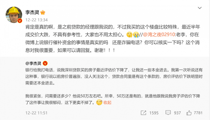 近日,知名数码博主李杰灵在微博上发帖称,自己在深圳贷款购买的房屋近期评估价出现下降,银行致电要求他按照合同约定补足50万元左右的本金。他透露,楼下的业主打六折出售房屋,影响了自己房屋的评估价。