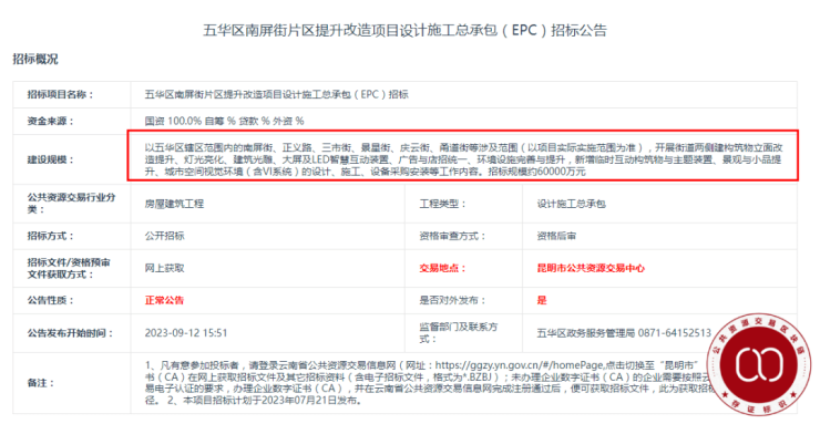 此次招标标段包括五华区南屏街片区提升改造项目设计施工总承包(EPC)、提升改造项目监理服务全以及过程造价咨询服务三项内容,招标总金额约6亿元。