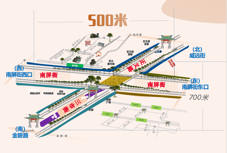 根据“昆明五华发布”微信公众号发布的南屏街示意图,当下,南屏街与正义路交叉形成主街,南屏步行街街区呈十字结构,昆明老街、南强街等国家历史文化名城街巷综合构成辅街,“一主两辅”三个街区中正完整。