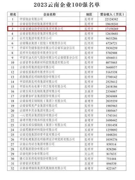 12月16日,云南省企业联合会、云南省企业家协会公开发布“2023云南企业100强名单”。