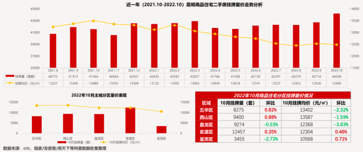 从各区表现来看,官渡区占据挂牌高位共有12457套,挂牌均价12303元/平方米;西山区及五华区占据成交均价高位,其中,西山区挂牌量为9400套,挂牌均价13587元/平方米,五华区挂牌量为8274套,挂牌均价为13402元/平方米;盘龙区挂牌量价小幅下滑,共有9274套,挂牌均价12368元/平方米;呈贡区挂牌量小幅下滑,共有3455套,挂牌均价10568元/平方米。