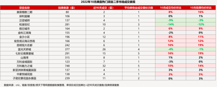 典型项目中,从各项目近90天成交套数来看,万科魅力之城(成交32套)、蓝光天娇城(成交26套)、七彩云南第壹城(成交15套),从价格走势来看,典型项目中近五成项目表现出挂牌及成交均价均上扬走势,部分项目表现企稳均价无明显变化,仅少部分项目均价下滑,市场热度小幅抬升。