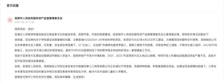 回复中写到,目前KCGD2021-26号地块配建的学校项目主体建筑已经完工,但由于巫家坝片区基础设施建设所需投入资金大,且受市场大环境影响,2021、2022 年巫家坝片区土地出让困难,导致可投入的基础设施建设资金严重不足,造成该项目建设进度缓慢。