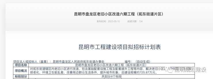 5月10 日,云南省公共资源交易信息网发布《昆明市盘龙区老旧小区改造六期工程(拓东街道片区)》招标计划表,根据计划,此次对拓东街道辖区内老旧小区进行改造,包含基础配套设施工程及配套提升工程等内容,解决老旧小区建筑物和配套设施破损老化,环境卫生脏乱差,改善周边群众生活条件,提升城市形象,总建设规模约725.87万元。