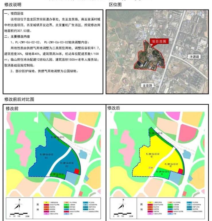 地块原为供燃气用地,此次调规后,PL-ZWY-E6-02-02和PL-ZWY-E6-03-02两宗地块用地性质调整为二类住宅用地,面积约229亩,容积率1.7,建筑密度30%,绿地率40%,限高36米,配建12班幼儿园。