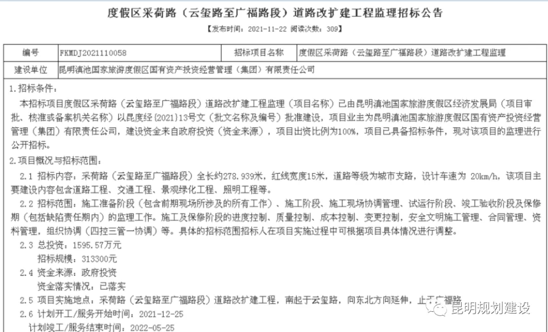 11月22日,昆明滇池国家旅游度假区国有资产投资经营管理(集团)有限责任公司和昆明复地房地产开发有限公司,分别发布《度假区采荷路(云玺路至广福路段)道路改扩建工程监理招标公告》《西山318号路(前兴路-南博路)新建工程施工招标公告》,将投资1595.57万元和20514.6万元,对采荷路(云玺路至广福路段)道路改扩建,新修西山318号路(前兴路-南博路)。
