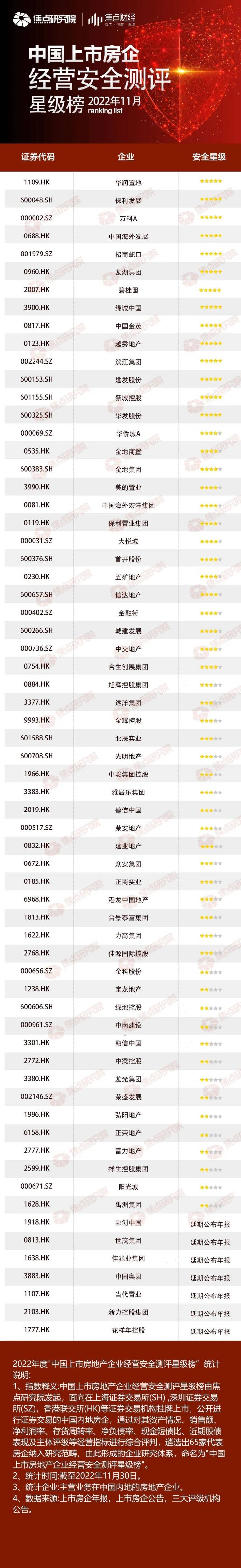 前11月销售额同比下滑仅12%,公司投资更加聚焦核心城市。从长期表现来看,在销售方面,招商蛇口1-11月销售额为2495.8亿元,同比减少11.8%,低于焦点研究院统计的30家典型房企累计销售额同比降幅42.2%,招商蛇口在市场下行期表现出较好的抗压能力。在投资方面,2022年以来招商蛇口投资态度相对积极,且核心城市占比提升,整体投资策略更为聚焦。在收并购方面,企业还积极参与民营房企纾困,陆续与佳兆业、半岛城邦和富力地产等合作,后续市占率有望持续提升。在负债方面,企业2022年三季度末三条红线维持“绿档”水平,资产负债表安全边际较高。基于以上短期与长期经营表现,招商蛇口在本次测评中获得5星级。