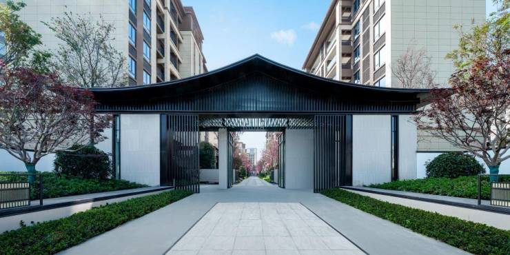 园区已呈现实景承袭“府系”建筑风格,建筑立面采用新中式风格设计,以大面积线条装饰放大了景观视野融合玻璃+金属+真石漆+石材的高级立面,使得园区整体呈现出威严、恢弘又不失雅致的建筑之美。