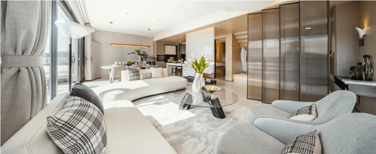 创意性让外部庭院与内部空间融为一体,让“下叠与私家庭院相连通,上叠与起居露台相承……”,在大幅提升观景视野和空间使用率时,也在视觉上让居住空间更加奢敞、明亮。