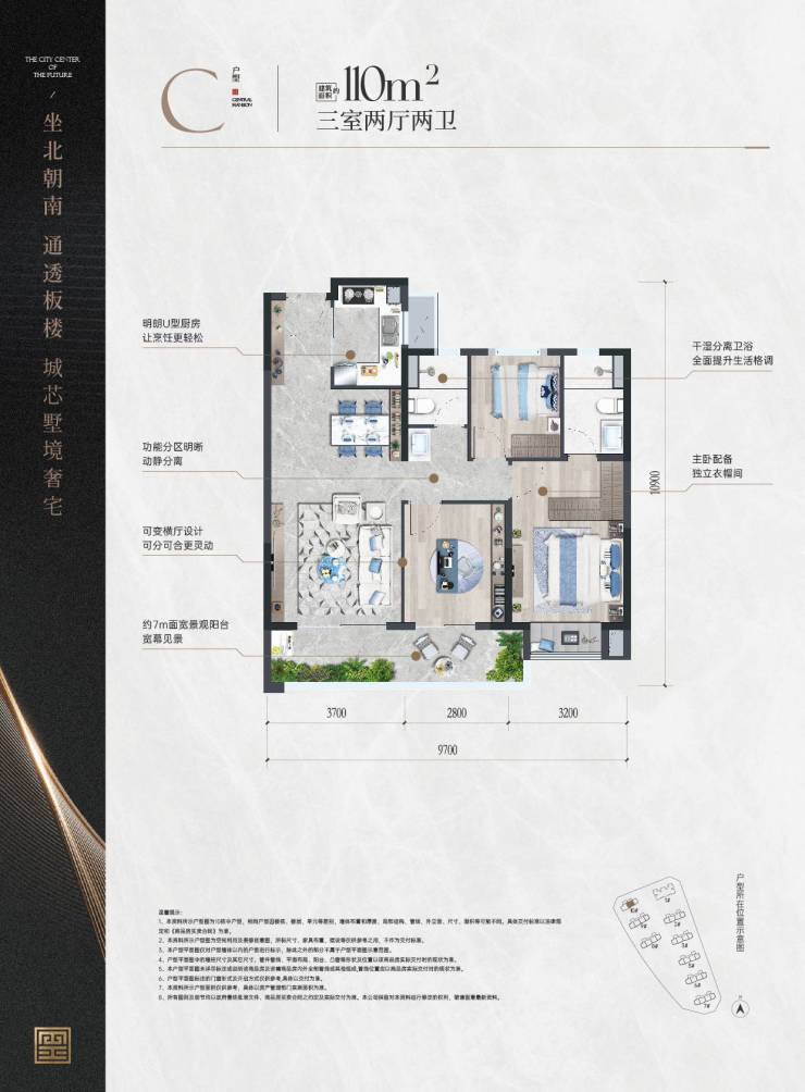 建面约110㎡户型,约7米面宽的景观阳台将更多的旖旎风景,明媚阳光和清新空气引入室内,让居家生活更加舒适轻盈。主卧配备独立衣帽间,让男女主人的衣物、饰品井然有序,主卧独立卫浴,尽显奢雅独到的起居体验。少剪力墙,可变横厅设计,给业主留了灵活改造的可能。