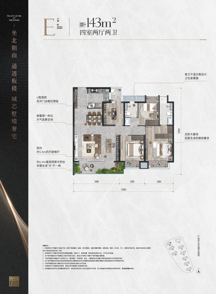 建面约143㎡户型客餐厨一体化,营造非凡空间阔度,同时增加厨房与客厅的生活互动感和社交感。南向约5.8米的尺度横厅与约6.4米面宽的阔景大阳台相连,将采光面、景观面、仪式感和尊贵感都做到极致。