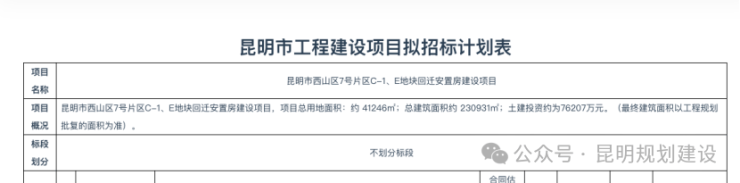 5月7日,云南省公共资源交易信息网发布《昆明市西山区7号片区C—1、E地块回迁安置房建设项目》招标计划,该标段主要包括昆明市西山区7号片区C—1、E地块回迁安置房建设项目勘察、初步设计服务,以及项目设计施工总承包和监理服务。