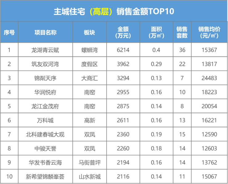 本周住宅成交6.83万㎡,环比上涨37%。主力成交项目为主力成交项目为龙湖青雲赋36套,0.4万㎡;筑友双河湾22套,0.29万㎡;北科建春城大观15套,0.19万㎡等 ;