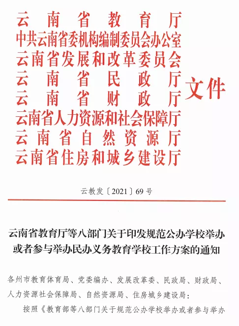 日前云南省教育厅等八部门联合发布《关于规范公办学校举办或者参与举办民办义务教育学校的工作方案》对三类“公参民”义务教育学校进行规范符合条件转公办不符合条件则停办
