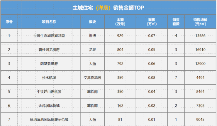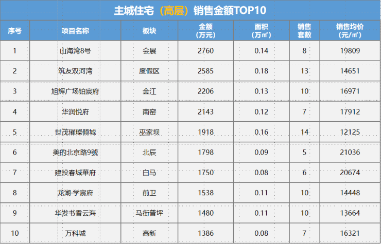 本周住宅成交3.85万㎡,环比下降30%;主力成交项目为筑友双河湾13套,0.18万㎡;世茂璀璨倾城14套,0.16万㎡;山海湾8号8套,0.14万㎡ 等。