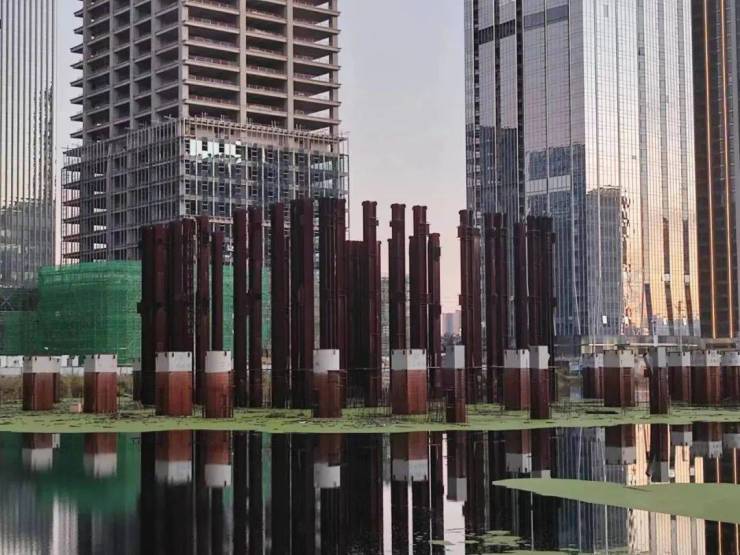 11月1日下午,记者在现场看到,景成大厦所在地块的基坑里有大量积水,颜色较深,基坑周边生长了水草,水上漂浮着大量浮萍,水中竖着的钢筋已经锈迹斑斑。基坑边上有提示牌上写着“基坑危险 请勿靠近”的字样。