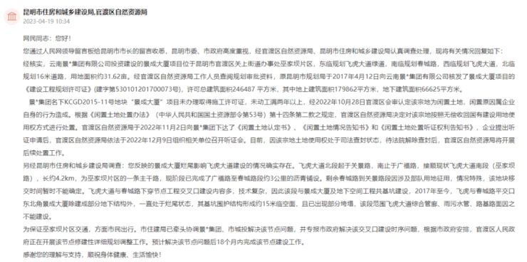 官渡区相关部门曾在回复中介绍,2022年10月28日,官渡区经过会审,认定该大厦使用地块为闲置土地,闲置原因系企业自身行为造成。