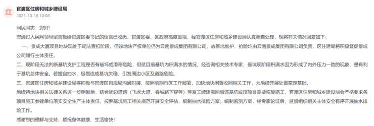 10月18日,官渡区住房和城乡建设局在给网友的回复中介绍:景成大厦项目地块现处于司法查扣阶段,产权单位目前仍是云南景成集团有限公司,基坑维护、抢险均由云南景成集团有限公司负责,住建部门将积极督促景成公司履行主体责任。