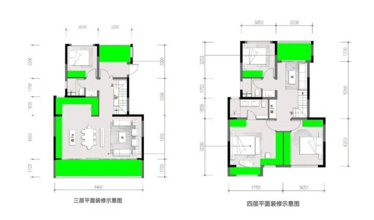 两个南向卧室面积稍小,仅能容纳一个衣柜,上层的两个南向卧室面积较大,能容纳两到三个衣柜,一家人的衣物收纳就基本足够了。