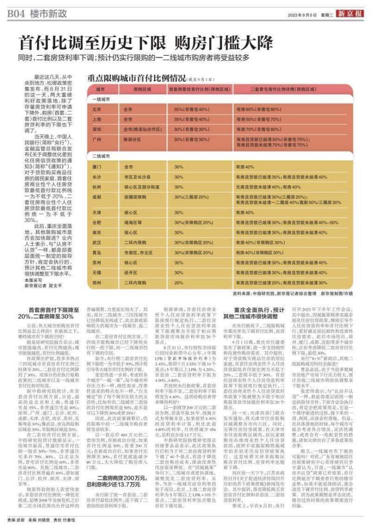 如今,央行将二套房首付比例下限统一为不低于30%,预计将引导各大城市首付比例的下调。