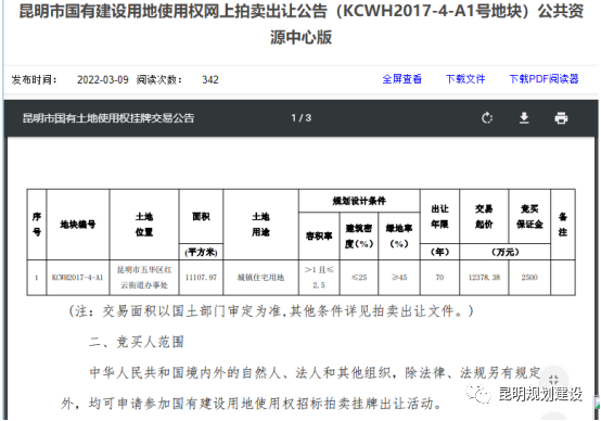 3月9日,昆明市公共资源交易中心发布了“昆明市国有建设用地使用权网上拍卖出让公告(KCWH2017-4-A1号地块)”。