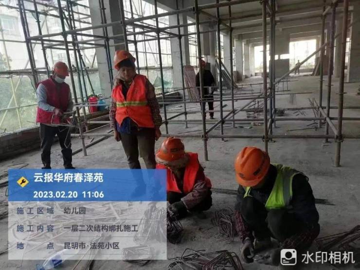 幼儿园:1-7轴屋面女儿墙钢筋绑扎安装完成60%,模板安装完成30%;8-18轴屋面坡屋顶梁板模板安装完成50% ,柱筋绑扎完成70%。