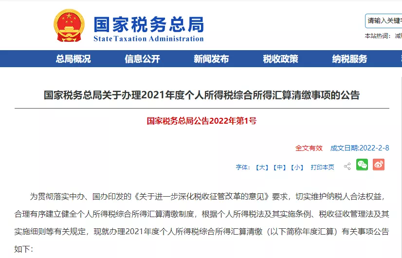 2月9日国家税务总局发布公告从2022年3月1日至6月30日符合相关规定的居民个人需要办理2021年度个人所得税综合所得汇算清缴事项