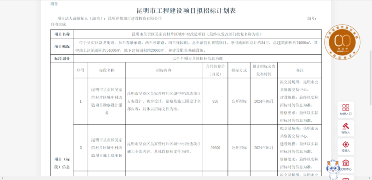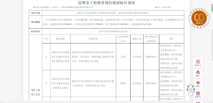 2月28日,云南省公共资源交易信息网发布了《昆明市呈贡区吴家营村片区城中村改造项目》和《昆明市呈贡区龙街村片区城中村改造项目》招标计划。
