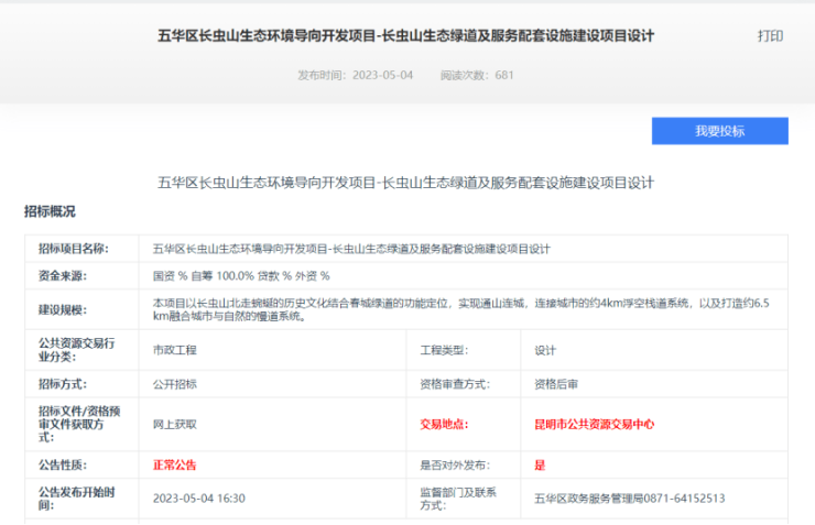 近日,五华区国有资产投资经营管理有限公司发布《五华区长虫山生态环境导向开发项目——长虫山生态绿道及服务配套设施建设项目设计》招标公告。