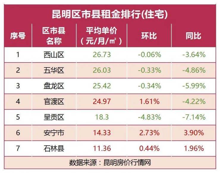 昆明租金同比跌幅约3%,位于二线城市跌幅榜第三位。