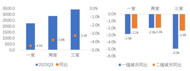 在成交户型上,一居室同比下跌4.5%,同比跌幅最大。二居室仍然是成交主力军,占比超过40%。三居室的成交占比在今年三季度首次超过一居室,达到28%。