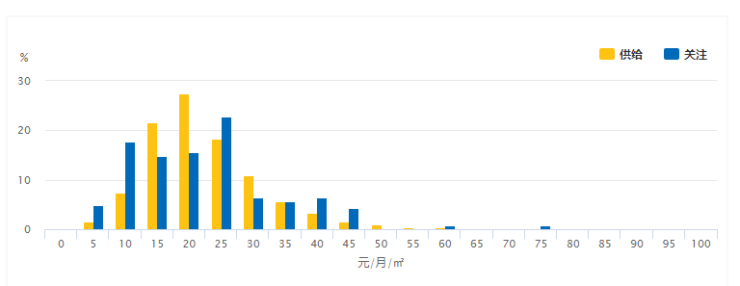 通过供给房源可以看到,主力市场房源为20元/月/㎡区间,而高于50元/月/㎡的租金就无人关注了,此类房源也相对较少。