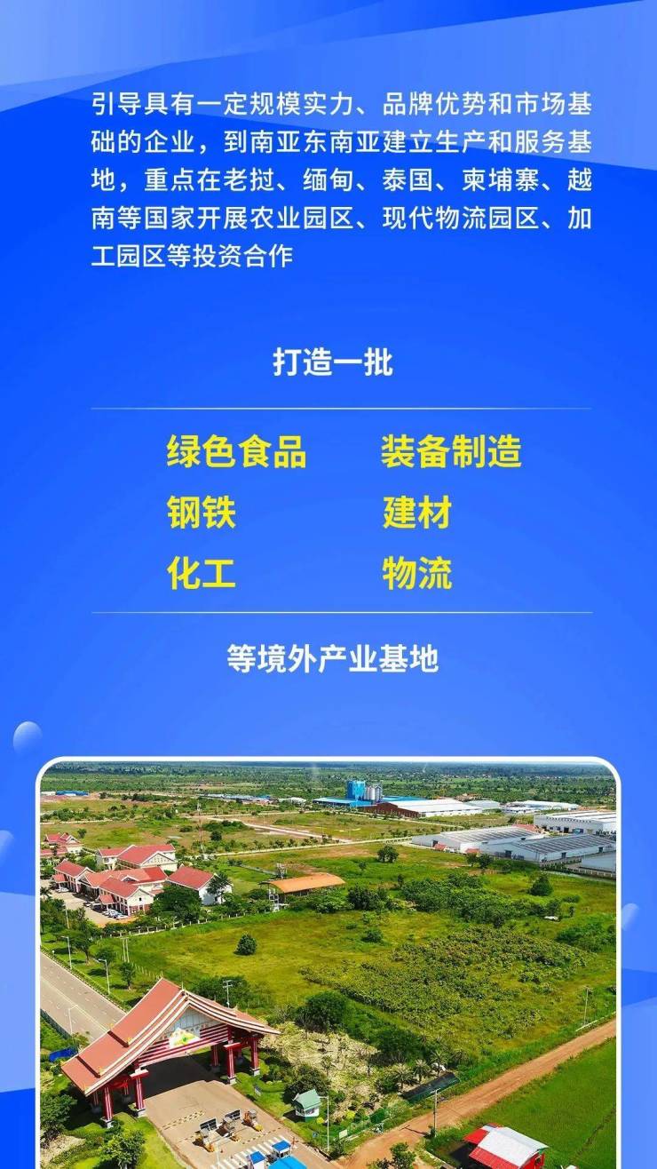 《方案》提出,将积极承接产业转移、推进跨境产能合作,进一步聚焦产业带动。具体来说,将打造跨境产业合作示范区,包括探索建立总部及研发、销售、结算环节在昆明,制造、装配环节在境外的跨境产业合作模式。积极推动自贸试验区昆明片区、高新区等开发开放平台(园区)与老挝磨丁经济特区、老挝万象赛色塔综合开发区等形成错位发展、互补融合、联动支撑的发展格局,共同打造产业集群。引导具有一定规模实力、品牌优势和市场基础的企业,到南亚东南亚建立生产和服务基地,重点在老挝、缅甸、泰国、柬埔寨、越南等国家开展农业园区、现代物流园区、加工园区等投资合作,打造一批绿色食品、装备制造、钢铁、建材、化工、物流等境外产业基地。推动实施“重资产投资运营”和“轻资产管理输出”模式创新,助力搭建良好境外载体支持企业“抱团出海”,拓展国际产业合作新空间。