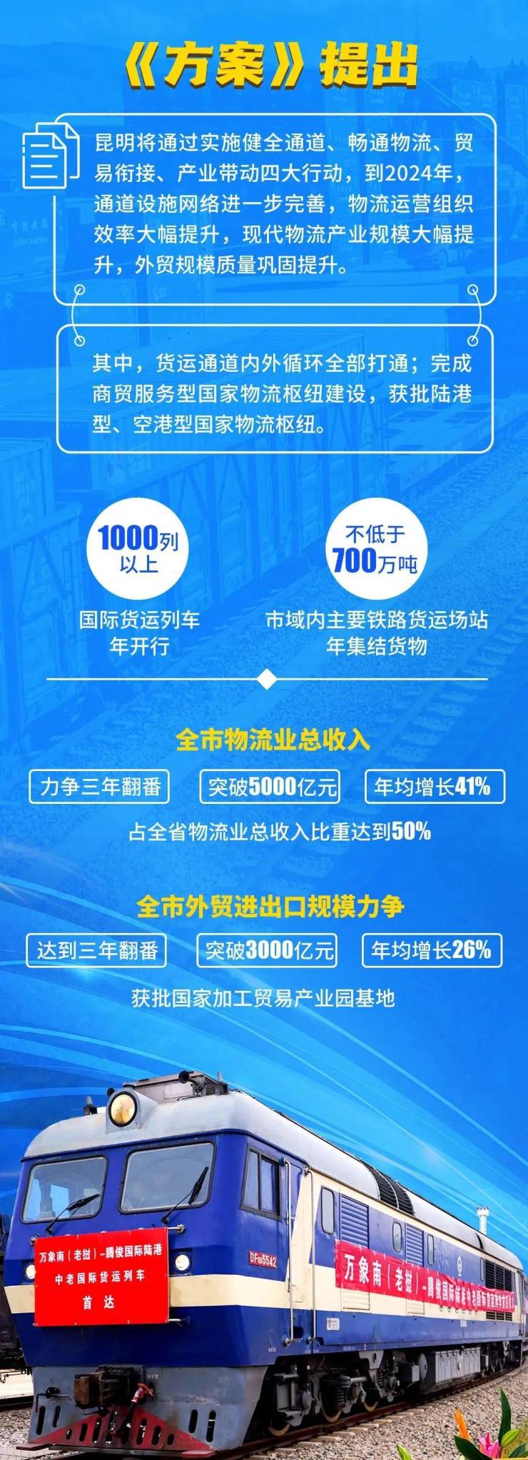 《方案》明确,昆明将搭建高效专业的国际班列和通道经济市场化运营主体,协同打造货运信息平台。支持企业在中老铁路沿线重要物流节点建设边境仓、海外仓。