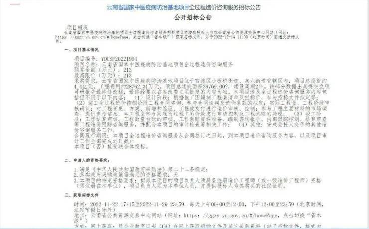 12月22日,云南省公共资源交易信息网发布了《云南省国家中医疫病防治基地项目方案设计及初步设计招标(二次)招标公告》(以下简称“公告”),从位置来看,该项目位于昆明市官渡区,正是云南省中医医院安和院区所在的位置。