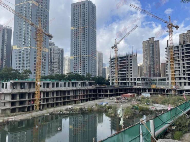 项目还处于开发初期便遇停工,仅有几栋建筑主体建至地面10余层,剩余地块还在基坑中,大片空地已经成了“鱼塘”,工地内无响动,出入通道处于关闭状态,也没能看见施工人员。