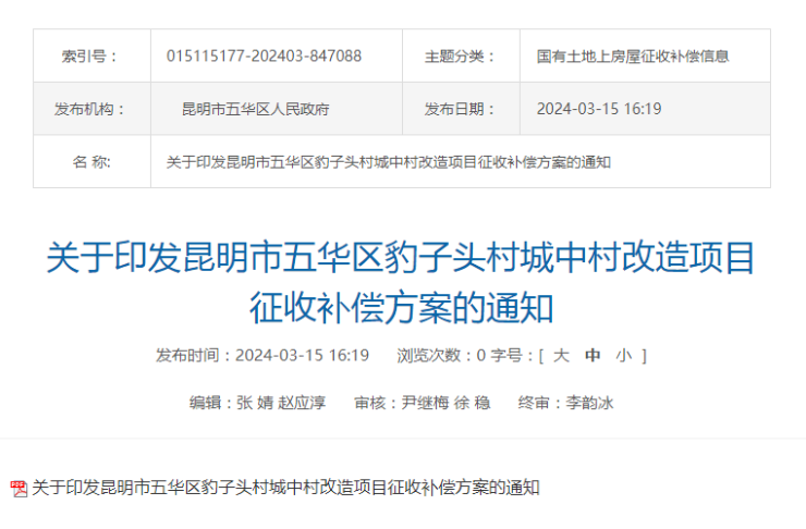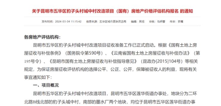 3月15日,五华区人民政府发布《关于印发昆明市五华区豹子头村城中村改造项目征收补偿方案的通知》,这意味着该城改项目已在快速推进中。