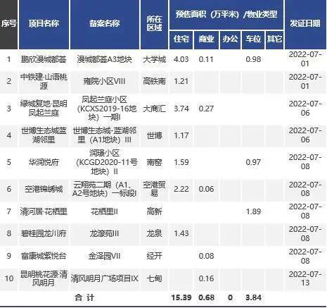 预售统计:昆明主城区新增住宅预售15.39万m²