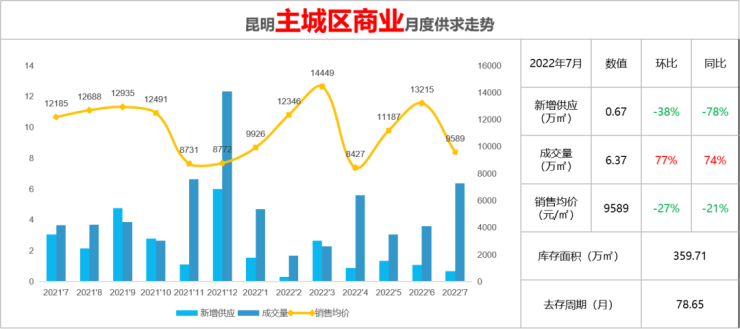 2022年7月昆明楼市:主城住宅成交量环比持平,均价环比略降