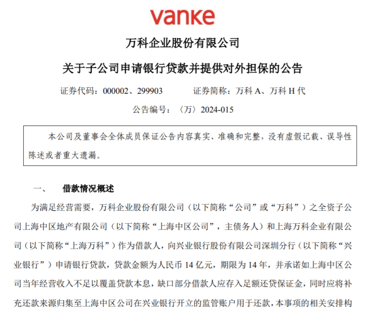 公告显示,上海中区公司是上海万科的全资子公司,此次申请贷款是为了偿还万科在存量房地产领域相关贷款和公开市场债券。