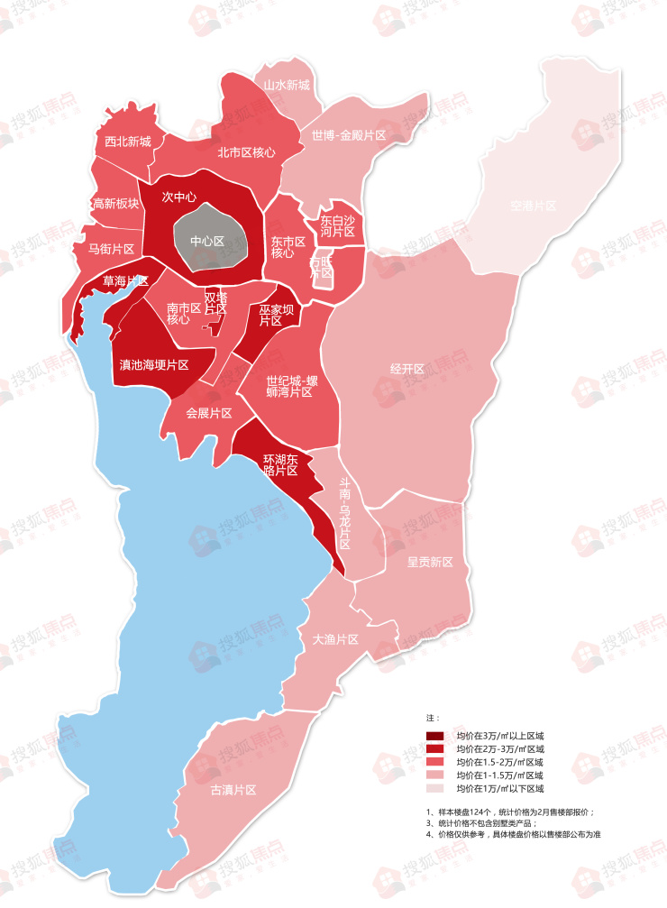 2月房价地图在区域上没有变动,中心区目前仍无新房在售,区域数继续维持在24个。