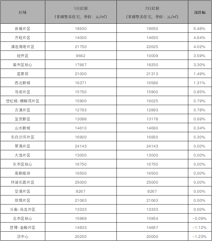 由表可知,12个区域房价环比1月上涨,其中以会展片区涨幅较高,为5.48%,其次是方旺片区、滇池海埂片区、经开区及南市区核心,涨幅均在3%以上。