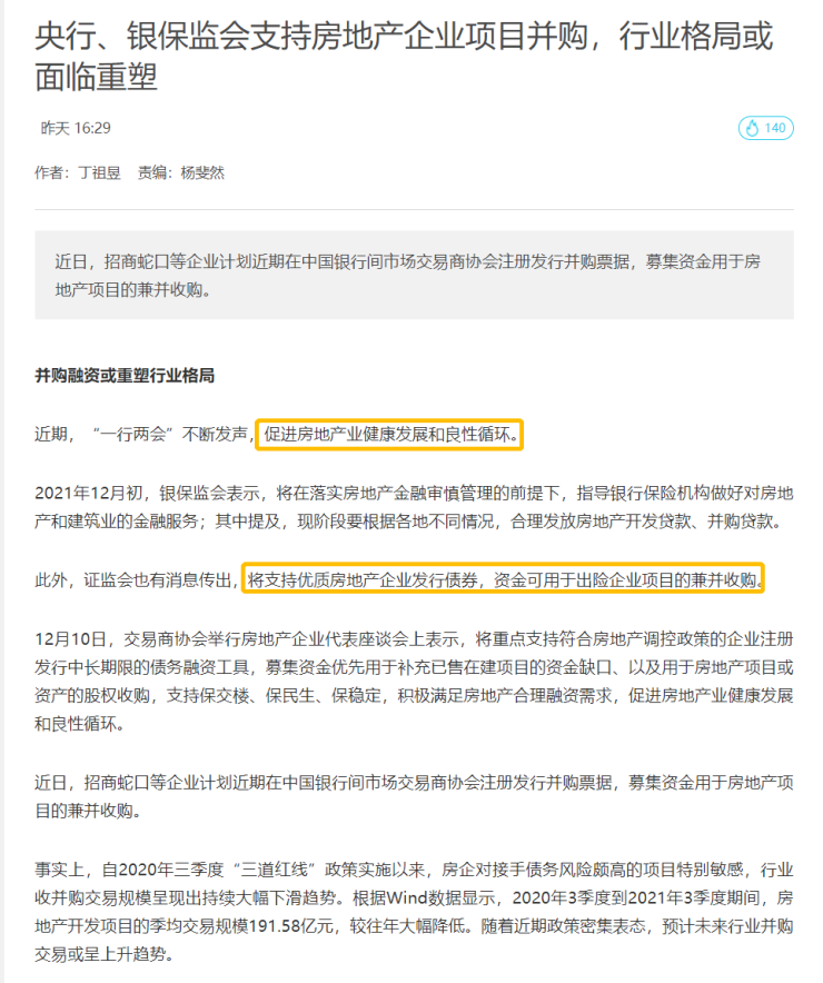 央行降准0.5个百分点后,又有好消息传出。据中国央行主管《金融时报》,近日,央行、银保监会出台《关于做好重点房地产企业风险处置项目并购金融服务的通知》,鼓励银行稳妥有序开展并购贷款业务,重点支持优质的房地产企业兼并收购出险和困难的大型房地产企业的优质项目。
