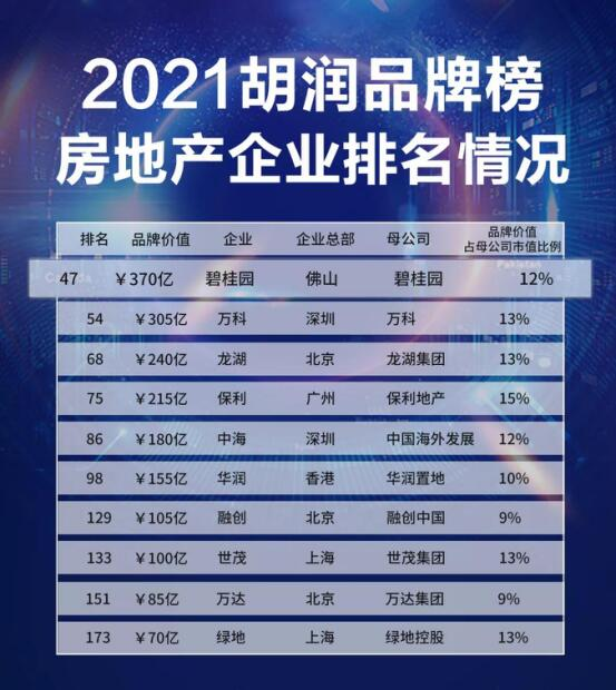碧桂园以370亿元居《2021胡润品牌榜》地产行业排名前列