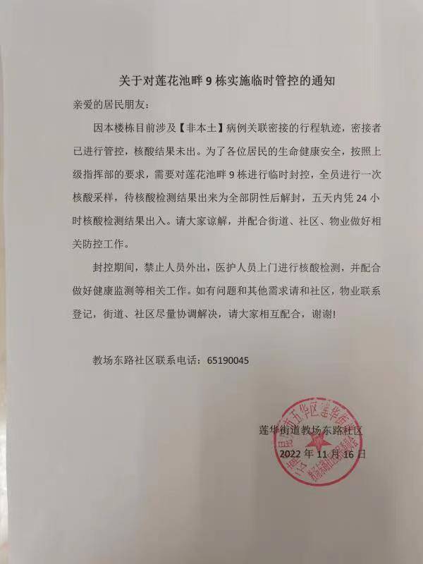 莲华街道教场东路社区发布《关于对莲花池畔9栋实施临时管控的通知》。通知如下: