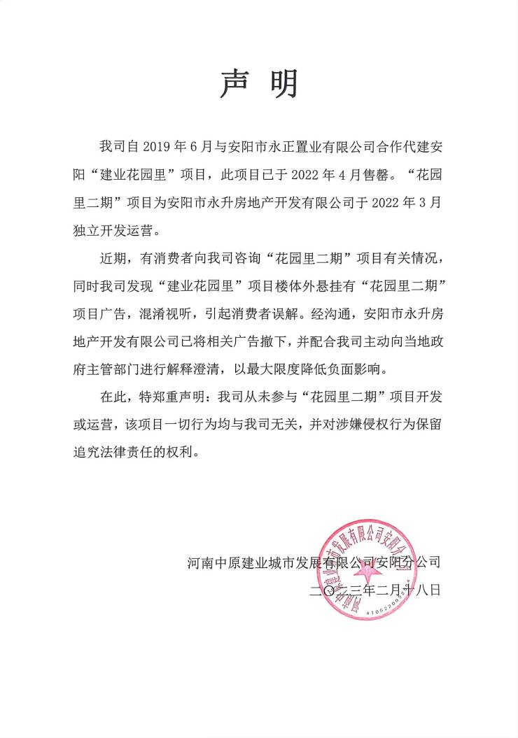 2月18日,建业集团旗下代建公司中原建业发布声明称,近期,有消费者向我司咨询“花园里二期”项目有关情况,同时我司发现“建业花园里”项目楼体外悬挂有“花园里二期”项目广告,混淆视听,引起消费者误解。经沟通,安阳市永升房地产开发有限公司已将相关广告撤下,并配合我司主动向当地政府主管部门进行解释澄清,以最大限度降低负面影响。