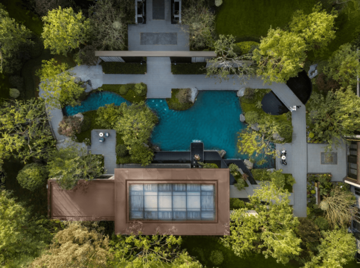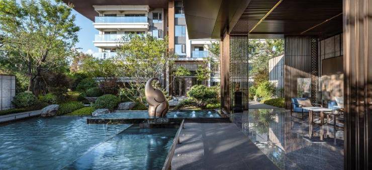 约44.6x8.8米威仪名门尊崇迎归,恢弘规制,显赫门楣徐展,打造酒店式归家礼序;聚澜庭,打造非遗文化空间,三层叠水而下,营造礼仪空间水景,从高处俯瞰犹如一只大象扬鼻戏水。