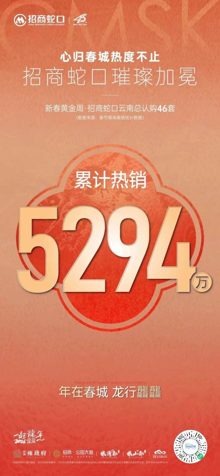 招商蛇口云南项目在新春黄金周(数据来源:春节期间案场统计数据)接待访客415组,总认购46套,累计销售额5294万元。