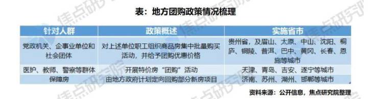 针对不同购房群体的需求,地方政策包括允许党政机关、企事业单位和社会团体团购新建商品住宅,并给予一定团购价格优惠;对特定人群,包括医护、教师、警察等群体,开展留住人才的惠民活动,具体包括开展特价房“团购”活动;地方政府团购房企已建设的房源作为保障房、试点集体土地建设保障房等。