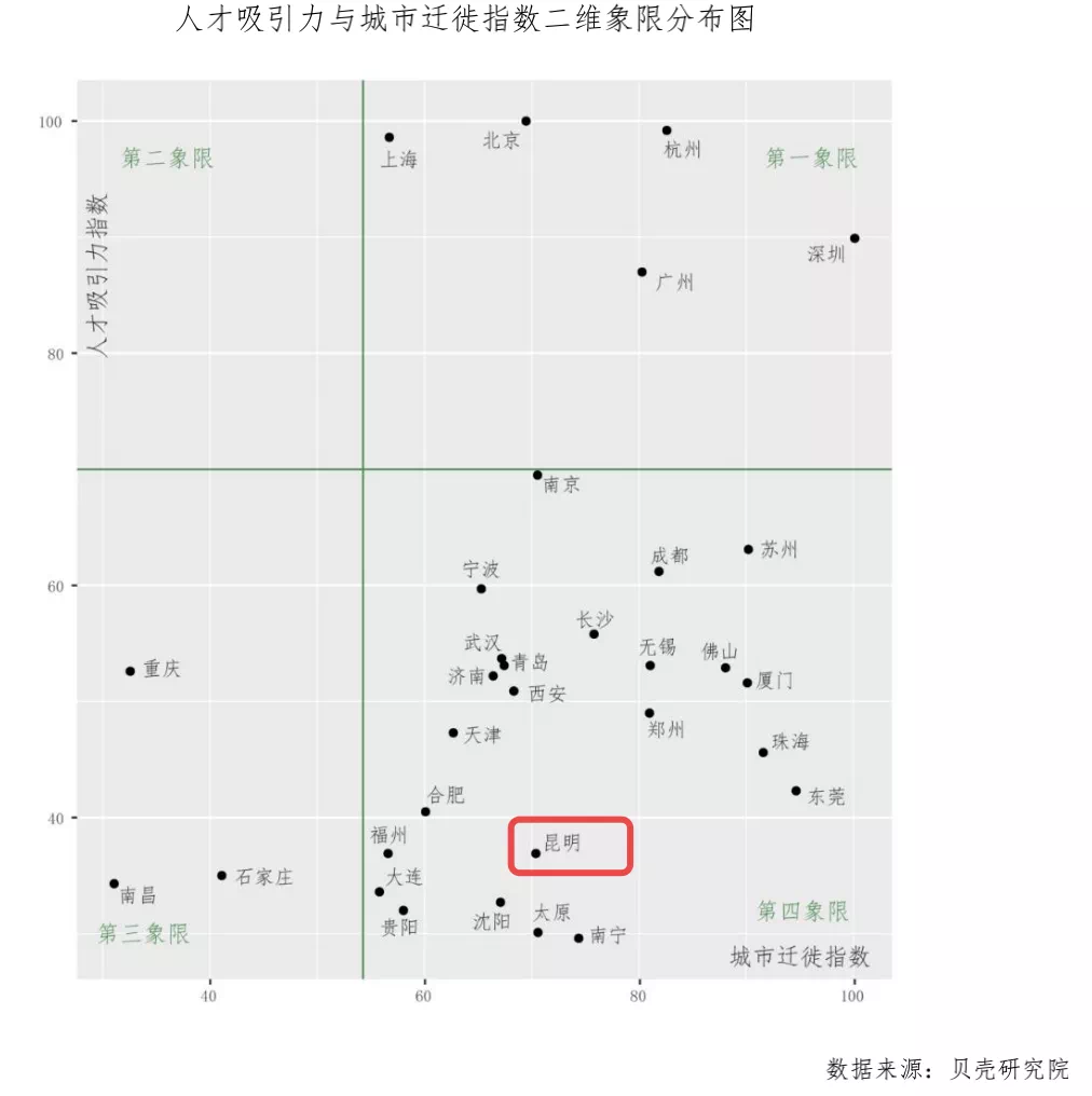 昆明位于“高迁徙-低吸引力”的第四象限